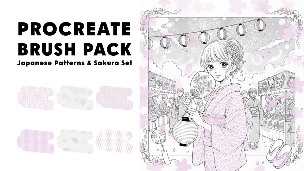 You'll get 6 essential manga-style brushes for Procreate, including custom patterns and sakura textures. Perfect for adding a dreamy, professional touch to your illustrations!